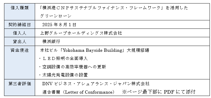 - 上野グループホールディングス、横浜港CNPサステナブルファイナンス・フレームワークを活用し、横浜銀行とグリーンローン契約を締結
