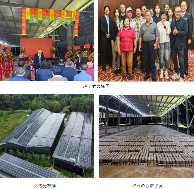 南投県は台湾産椎茸の主要産地として知られています。椎茸は日光を必要としない特性を活かし、今回、協働プロジェクトとして椎茸農場を活用した「魚池農電太陽光発電所」を建設しました。本プロジェクトは2023年11月に契約を締結、2025年11月に第1期工事が完了し、2026年秋に第2期工事の完工が予定されています。総設置容量は1,639.72kWで、従来の火力発電と比較して、年間約870トンのCO₂削減効果が見込まれます。