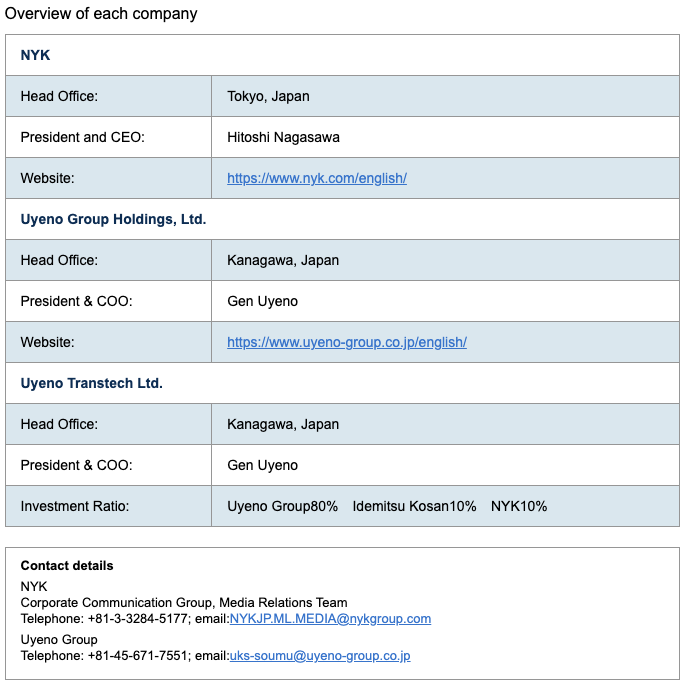 Gen Uyeno, president and chief operating officer of Uyeno Group Holdings, Ltd. commented, “I am pleased to announce that the Uyeno Group has entered into a capital and business alliance with NYK, one of the world's leading shipping companies and a comprehensive logistics group. The Uyeno Group aims to learn from the advanced technological capabilities, experience, and wisdom that NYK has cultivated over many years, especially in advancing efforts to address various issues in the domestic shipping business. I am confident that our alliance will greatly contribute to the realization of accident-free advanced vessels. Furthermore, while energy transformation progresses, NYK and the Uyeno Group will seek to create new value in the new energy field by working with each other in oceangoing shipping and domestic coastal shipping to create a one-stop service for customers.”