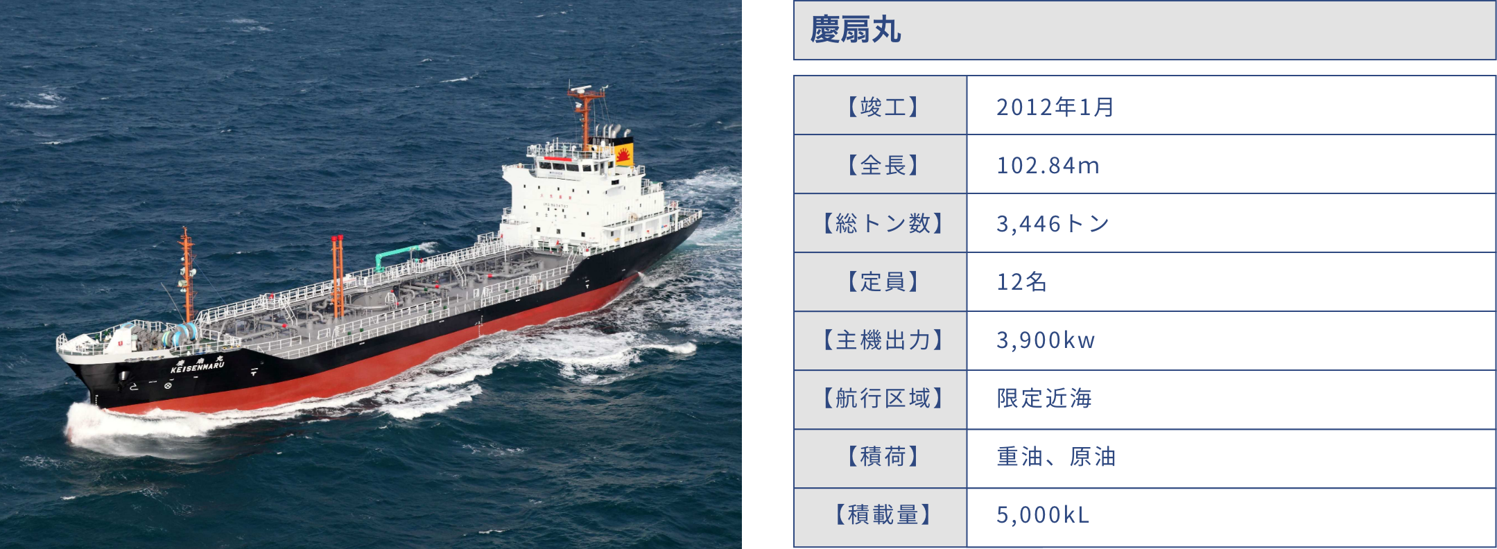 300キロリットル~6,000キロリットル積みまで、40隻のタンカーを運航しており、国内海上輸送における社会的責任を果たすとともに、石油元売会社、商社、電力会社など、エネルギー輸送に関するお客様のニーズに幅広くお応えしています。
