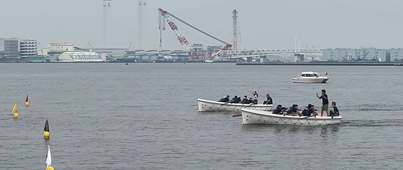 本レースは、長さ6mの救命ボートに8名の選手(艇指揮1名、艇長1名、漕手6名)が乗り、氷川丸前を折り返す往復360mのコースでタイムを競うものです。
