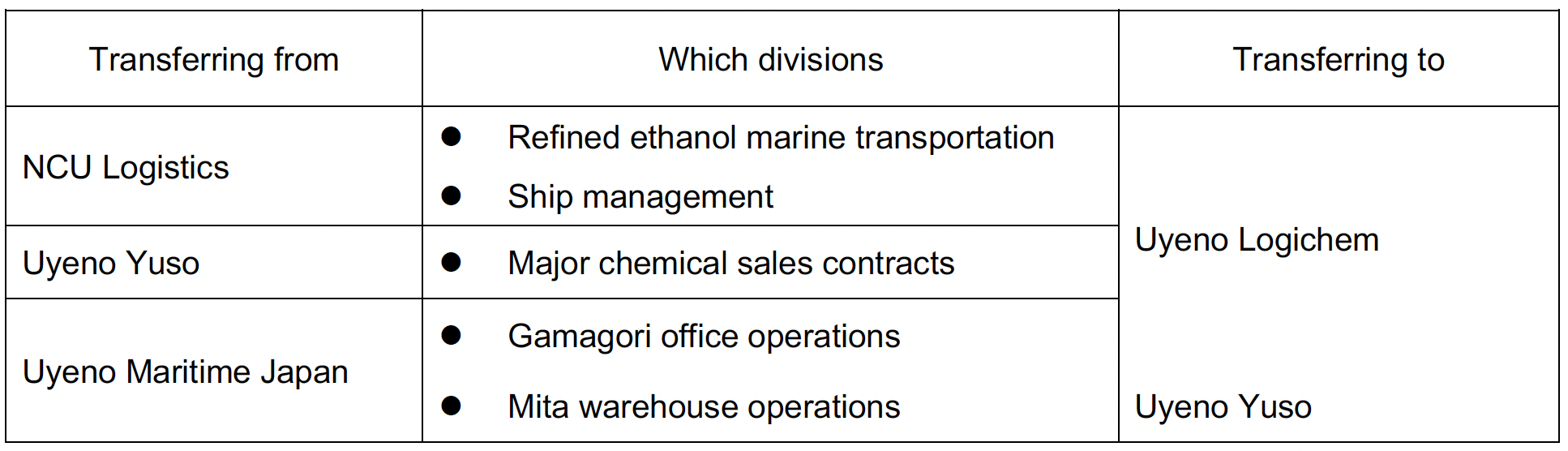 March 2, 2022 — Uyeno Group Holdings Ltd. announced that the Uyeno Group will carry out a business reorganization on April 1, 2022, in which it will transfer some business divisions from NCU Logistics Ltd., Uyeno Yuso Ltd. and Uyeno Maritime Japan, Ltd. to Uyeno Logichem Ltd. and Uyeno Yuso.